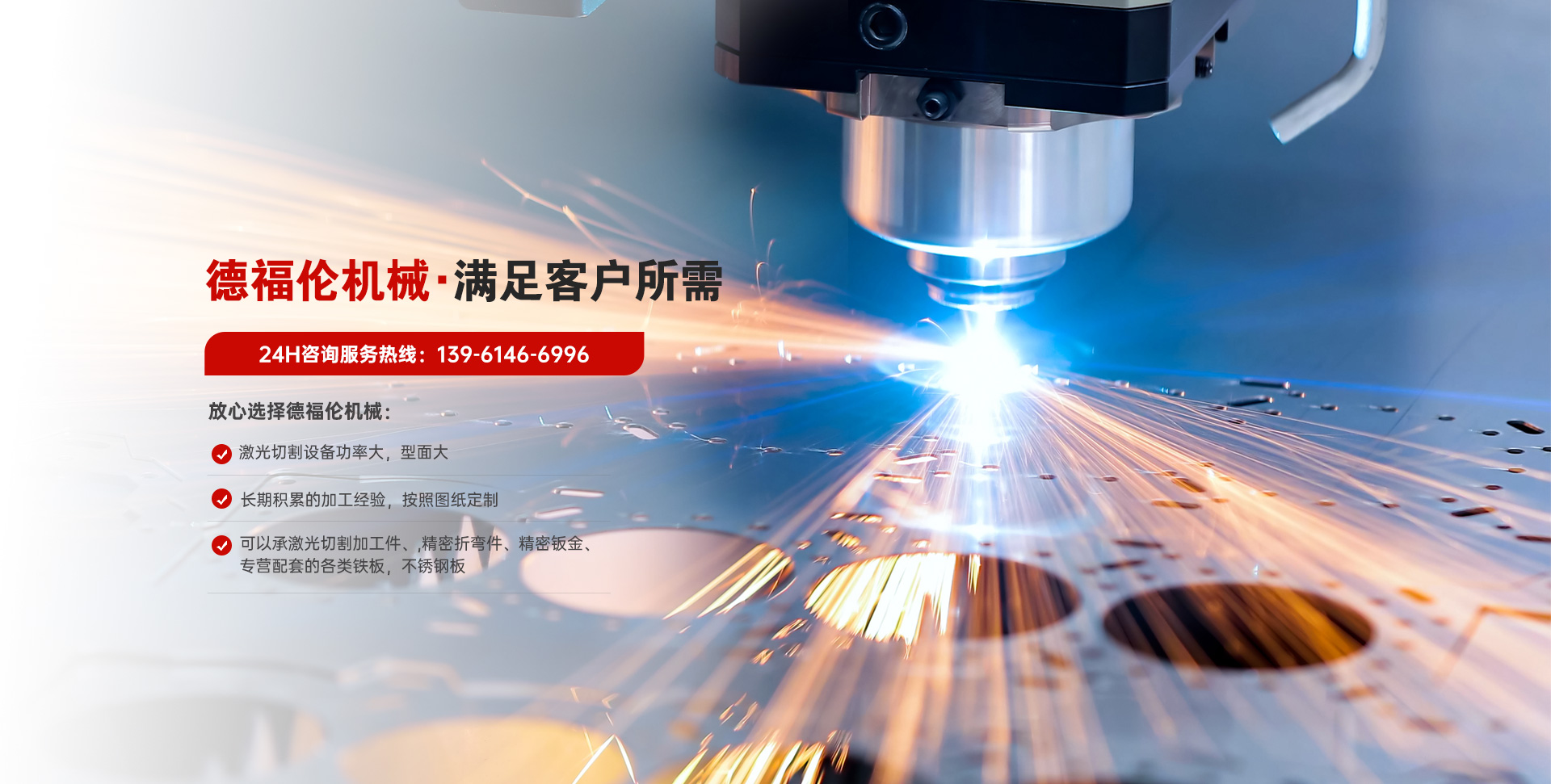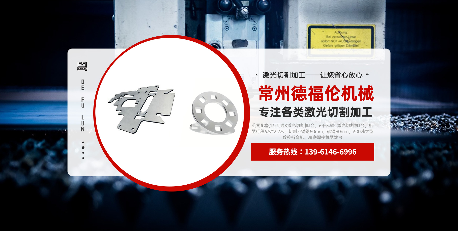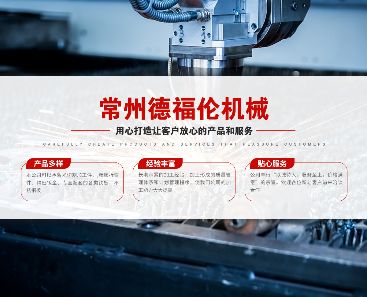 常州德福倫機(jī)械有限公司成立于2014年12月19號(hào),位于江蘇省常州市武進(jìn)區(qū)遙觀鎮(zhèn)建農(nóng)村劍童路56號(hào)西門(mén);公司配備;1萬(wàn)瓦通K激光切割機(jī)1臺(tái),6千瓦領(lǐng)C激光切割機(jī)1臺(tái);機(jī)器行程6米*2.2米,切割不銹鋼50mm,碳鋼30mm;300噸大型數(shù)控折彎?rùn)C(jī)。精密焊接機(jī)器數(shù)臺(tái)。本公司可以承激光切割加工件、,精密折彎件、精密鈑金、專(zhuān)營(yíng)配套的各類(lèi)鐵板,不銹鋼板。長(zhǎng)期積累的加工經(jīng)驗(yàn),加上形成的質(zhì)量管理體系和計(jì)劃管理程序,使我們公司的加工能力大大提高,滿(mǎn)足客戶(hù)所需,是我們公司的目標(biāo)!公司奉行“以誠(chéng)待人,服務(wù)為上,價(jià)格滿(mǎn)意”的宗旨。歡迎各位領(lǐng)導(dǎo);老總前來(lái)洽談合作!